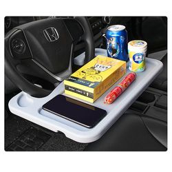 The steering wheel desk can be mounted to the car steering wheel and used by the driver for a laptop, notebook support or desk to write. Meanwhile, it can work on one side while the other side with a cup holder can be used for lunch, food, drink or snack. Ideal for long distance travel, computer, business trip, leisure use and it's also very suitable to travel with their own car especially families with children. It's made of Abs material.